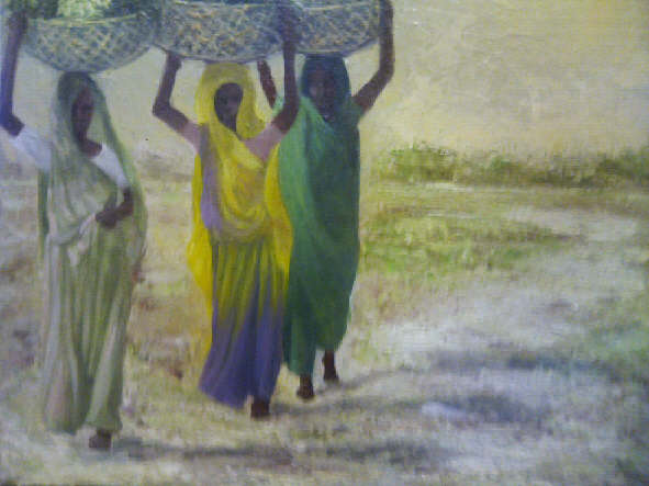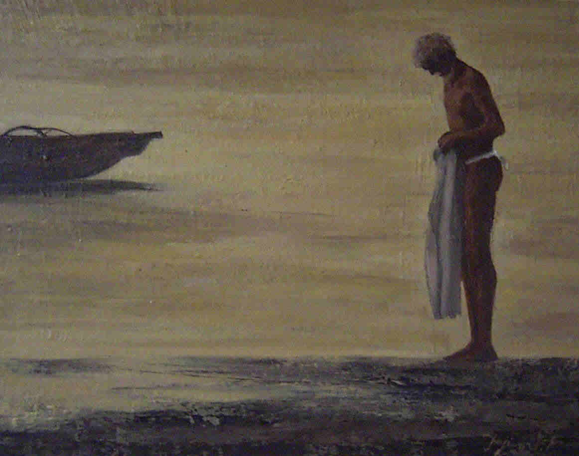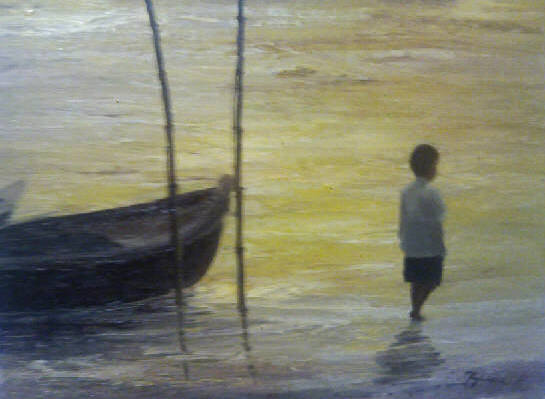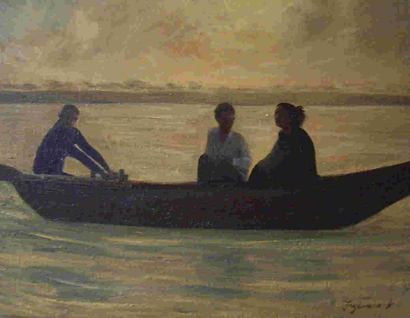 ”朝日を仰ぐ小舟の人々”