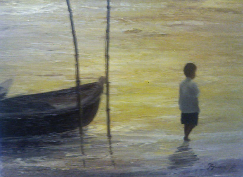 ”朝日を仰ぐ小舟の人々”